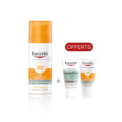 Eucerin – Oil Control Gel-crème SPF50+ 50ml, offre une protection solaire haute efficacité avec un effet matifiant longue durée. Livré avec un Oil Control Toucher Sec 20ml et un Dermopure Gel Nettoyant Triple Action 20ml en cadeaux.