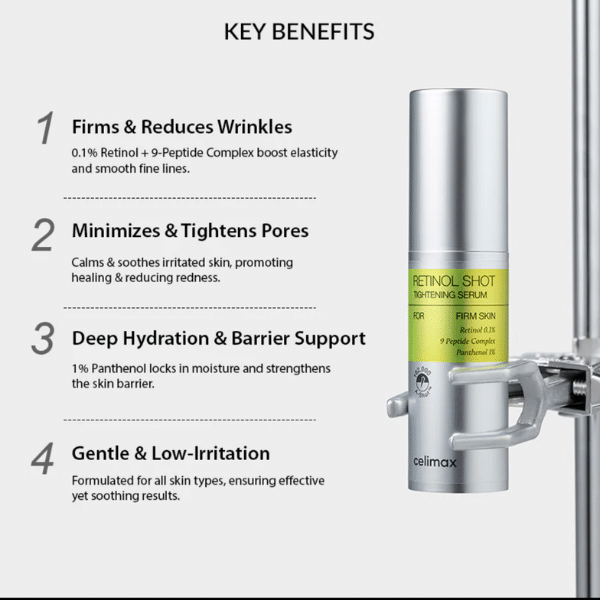 Le Celimax Retinol Shot Tightening Serum 30ml est un sérum anti-âge concentré au rétinol, conçu pour raffermir la peau, lisser les rides et améliorer visiblement la texture cutanée.