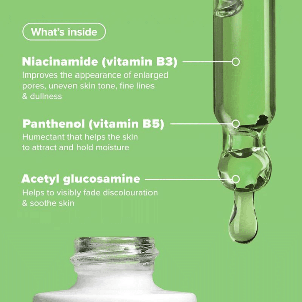 Niacinamide 10% (Vitamine B3) : aide à resserrer les pores, équilibrer la production de sébum et améliorer l’uniformité du teint.