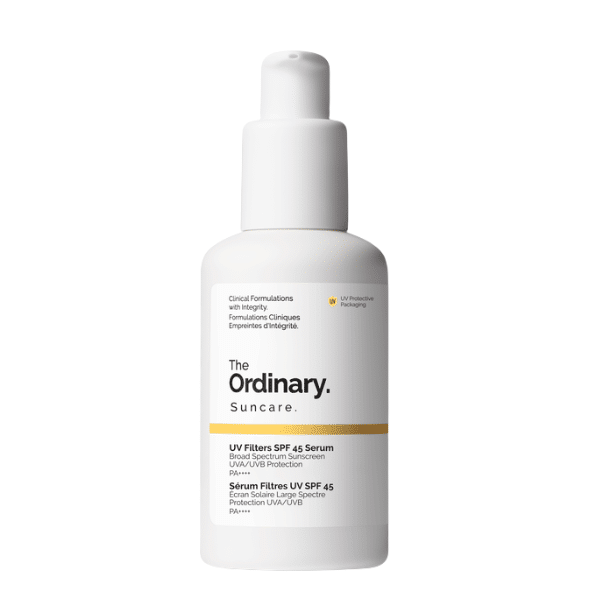 The Ordinary UV Filters SPF 45 Serum 60ml : écran solaire léger à texture sérum qui protège des UV, hydrate la peau et offre un fini naturel sans traces blanches.